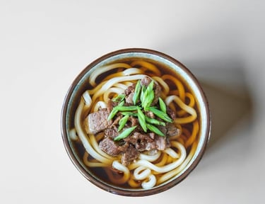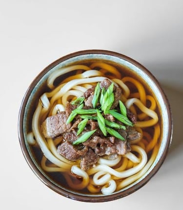 Comforting bowl of thick udon noodles in a savory broth, served with tender beef and fresh vegetables